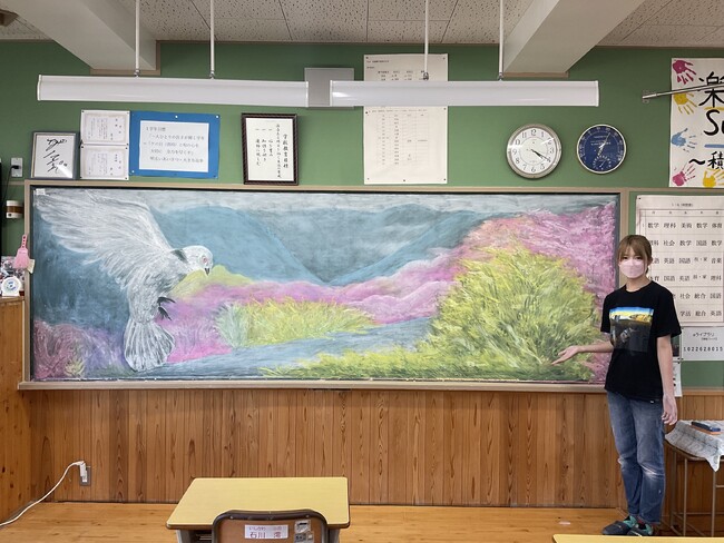 1年生から3年生の各教室の黒板に黒板アートを制作しました。同中学校にて、キャリア教育として、学生による質問座談会や作品制作に関するプレゼンテーションなども実施しました。