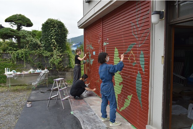 東秩父村所有の空き家のシャッターに、村の草花をデザインしたライブペイントを実施しました。あわせて、「東秩父村のお気に入りポイント」を撮影し、プリントアウトした写真を石膏に流し転写する『石膏アートワークショップ』、東秩父の特産である和紙を使用した『和紙てんと絵付け体験』のワークショップも開催しました。