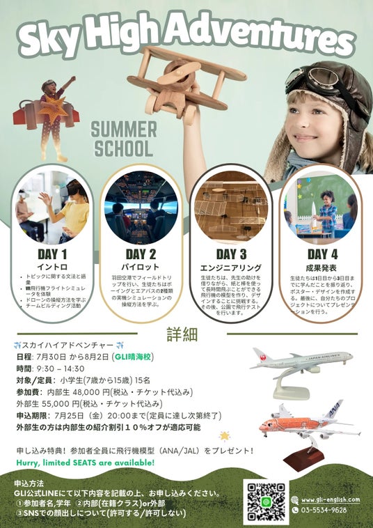 国内外のボーディングスクール進学をサポートするコンサルティング型英会話スクール「Global Learner’s Institute」(以下GLI)は、今年も毎年恒例の通学型サマースクールを開催いたします。今年の晴海校サマースクールのテーマは「Sky High Adventure(スカイハイアドベンチャー)」で、英語とSTEAM(科学、技術、工学、芸術、数学)を融合させた、学びと遊びが満載の4日間(7月30日~8月2日)となります。