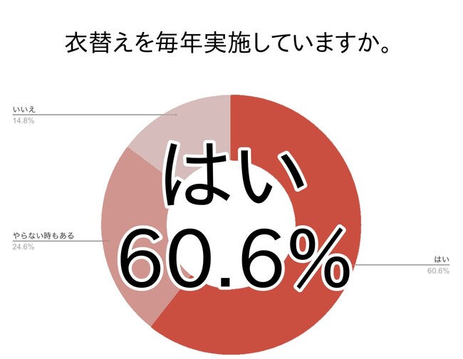 関東地域では、はい(衣替えを毎年実施している)と答えた方が最も多く、6割強(60.6%)でした。一方で、やらない時もある(24.6%)・いいえ(していない・14.8%)と答えた方を合わせると4割弱(38.5%)の方が衣替えをしない時があると答えていました。