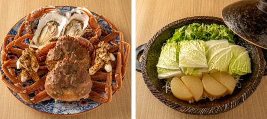活ズワイ蟹を松茸と殻牡蠣を大皿に盛り、土鍋野菜と一緒にご提供。 土鍋に食材を少しずつ追加していくと、1度で5度味の変化をお楽しみいただけるご馳走鍋になります。
