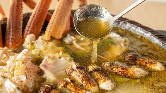 今回のメインである蟹鍋で使用するズワイ蟹は、提供当日に板前が丁寧に捌き、松茸と殻牡蠣も一緒に、大皿に盛りつけて提供。常連のお客様からの好評をいただいている、寿司番屋特製のお出汁をたっぷりと入れた野菜入りの土鍋に、松茸とズワイ蟹、牡蠣を少しずつ追加しながら加熱すると、1度で5度楽しめるご馳走鍋が完成します。蟹鍋はぜひ料理長直伝の美味しい食べ方でご賞味ください。