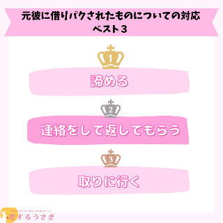 恋するうさぎ編集部が行った「元彼に借りパクされたモノを返してもらえたか」のアンケートによると1位:諦めるが73%、 2位:連絡をして返してもらうが16%、3位:取りに行くが7%という結果になりました。