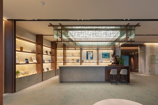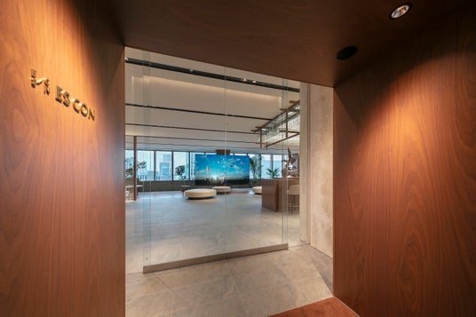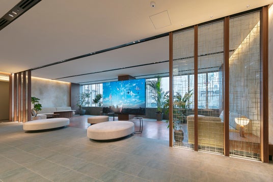 エレベーターホール正面にある重厚なエントランスホールの先には、180インチの大型LEDビジョンを設置した開放的なロビーがお客様をお迎えします。