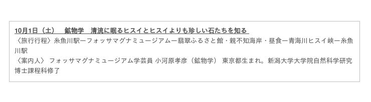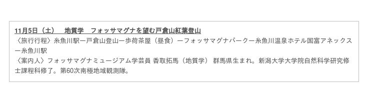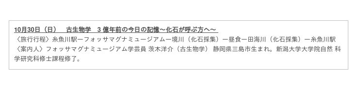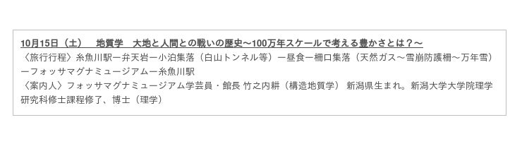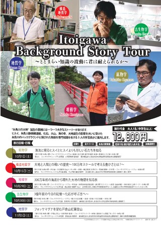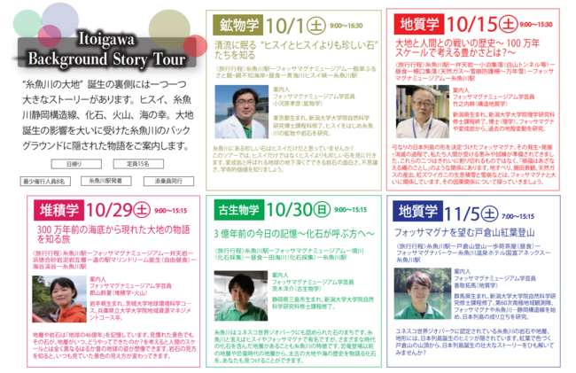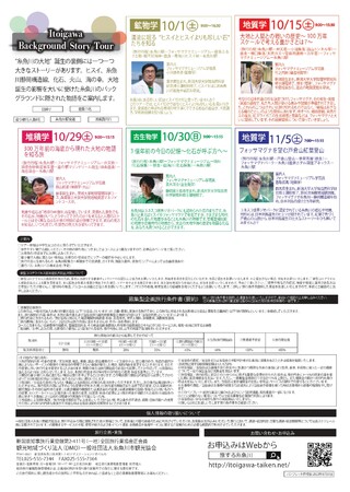 専門知識を有する糸魚川市の5人の学芸員が徹底解説する全5コースのツアーを、10月1日より5回に渡って開催。