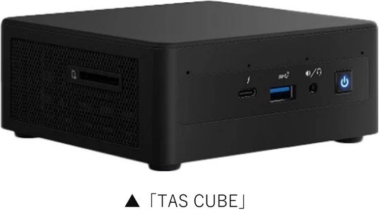 「TAS CUBE」は、2022年10月に発売を開始した「TAS」シリーズの最新製品となる小型AI解析PCで、外形寸法が幅117×高さ51×奥行112mmの手のひらサイズかつ、最大3台のセキュリティカメラを接続し同時にAI解析を行えることが特徴です。