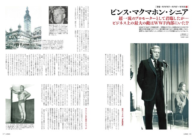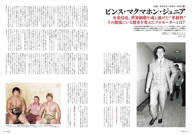 今年7月、不倫スキャンダルを報じられたWWEのビンス・マクマホン(・ジュニア)が会長兼CEO辞任を表明した。世界最大のプロレス企業は、ここから新時代に突入する。第1特集では親子3代にわたり勢力を拡大し、世界制覇を達成したマクマホン・ファミリーを軸に、WWWF~WWF~WWEと変遷してきた団体の歴史を貴重な写真と共に総括する。第2特集では新日本プロレスが製作したものの、諸事情により封印されたNWAインターナショナル・ジュニアヘビー級王座のベルトをお蔵出し。第2代王者・藤波辰爾、タイトル新設に深く関わった新間寿氏らの証言をもとに、「幻のベルト」の全貌に迫る。