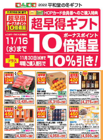 「平和堂HOPカード」「エールマインカード」会員様にはご購入特典をご用意しました。11月16日(水)までの期間限定として、ボーナスポイント10倍進呈となる超早得ギフトを限定72アイテム揃えたほか、11月30日(水)までの早期ご購入特典として、カタログ掲載商品全品本体価格より10%割引サービスをさせていただきます。また、通常の100~500ポイントのボーナスポイント進呈対象商品に加え、今回は創業65周年を記念したボーナスポイント650ポイント進呈商品などお得な企画を多数取り揃えております。