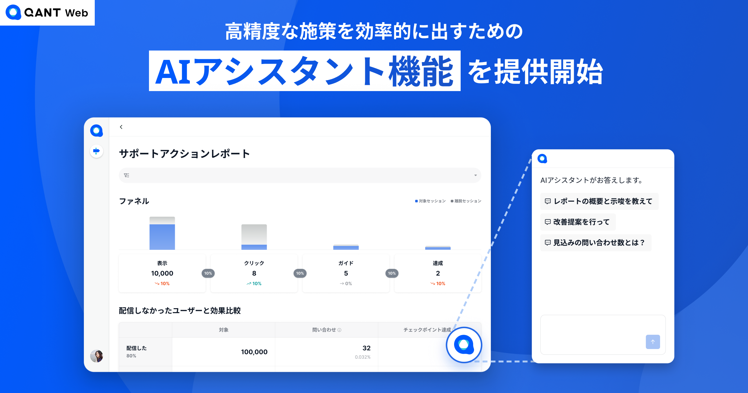 こうしたお悩みを解決するため、RightTouchは、分析から施策作成、改善・振り返りまでのプロセスを支援する「AIアシスタント機能」をQANT Webに追加しました。
