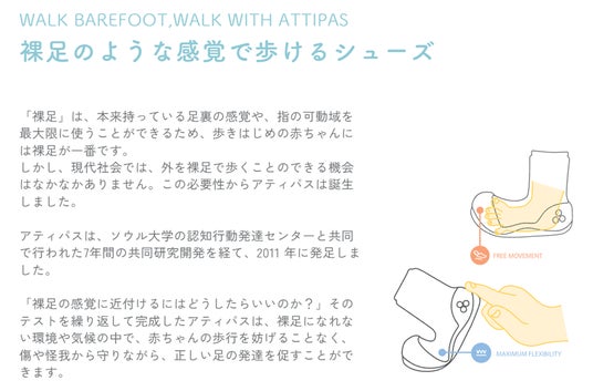 Attipas(アティパス)は、成長によって変化する赤ちゃんの足に着目し、産学共同で7年にも及ぶ研究の結果に基づいて作られた歩育シューズです。2011年にスタートし、今ではオーストラリア、スペイン、アメリカなど世界30ヵ国以上のママやパパに愛される安心、安全のブランドです。