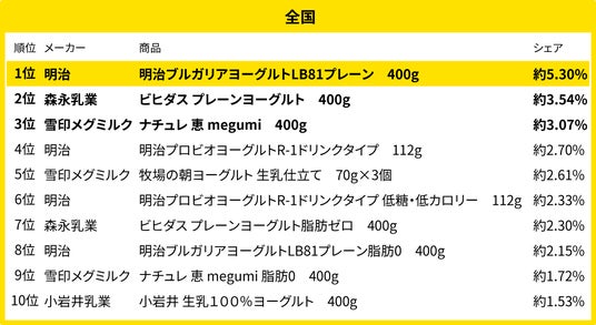 大容量サイズの「プレーンヨーグルト」が全国+7つの地方で1位を獲得!