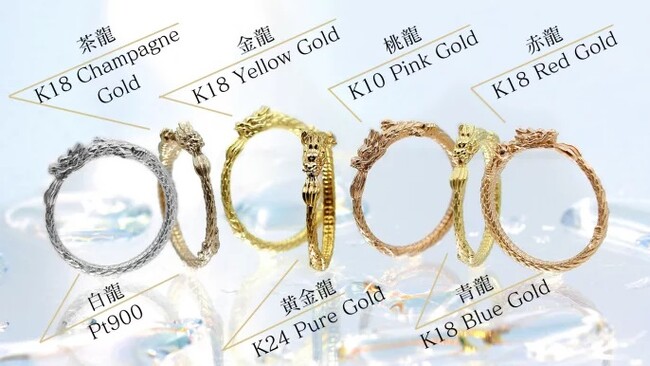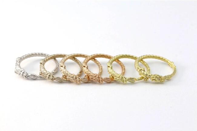 今回は、純金以外にも6色の価値ある素材で龍のリングをご用意しました。金には様々なカラーバリエーションがありますが、6色の金に“白金”と言われるプラチナ900を入れた7色をお届けします。