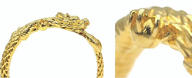 ぐるりと身体を覆う鱗の細かい表現。足と手、爪や水晶まで細かく丁寧に作られています。顔と尻尾がつながった、龍がそのままリングになったデザインです。