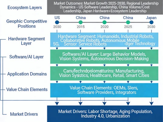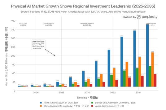特に注目すべきは、北米資本が投資全体の82%を占める一方で、中国が低価格化とスケール戦略で追い上げ、日本が高齢化対応サービスロボットとハードウェア統合で独自の道を走り始めたという地政学的な多極化である。本レポートは、その動態を時系列・地域別・プレイヤー別に解き明かしている。