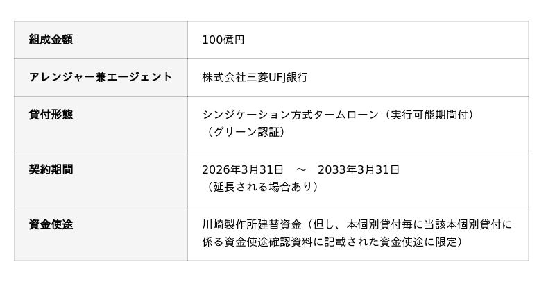 三菱化工機株式会社(代表者:田中 利一 所在地:川崎市、以下「当社」)は、株式会社三菱UFJ銀行をアレンジャーとして、本社・川崎製作所の再編成を資金使途とした「グリーンローン」によるシンジケーション方式のタームローン契約を、2026年3月31日付で締結しました。本ローンは、「三菱 UFJ銀行グリーン及びサステナビリティ・リンク・ファイナンスフレームワーク」(以下、「本フレームワーク」)に準拠しています。本フレームワークは DNV ビジネス・アシュアランス・ジャパンによる第三者意見を取得しています。