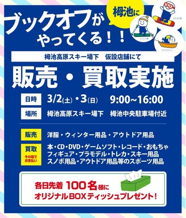 大会期間の3月2日(土)、3日(日)には、栂池中央駐車場付近で本や、CD・DVD、おもちゃ、スポーツ用品など様々な商品の販売・買取を行うブックオフ仮設店舗を出店します。各日先着100名様にオリジナルティッシュBOXをプレゼントいたします。