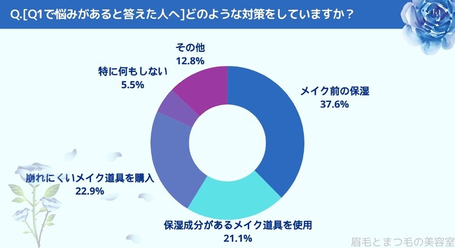 [Q1で悩みがあると答えた人に]どのような対策をしているかお聞きしたところ「メイク前の保湿(37.6%)」、「保湿成分があるメイク道具を使用(21.1%)」、「崩れにくいメイク道具を購入(22.9%)」、「特に何もしない(5.5%)」、「その他(12.8%)」という結果になりました。