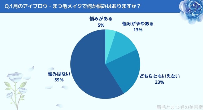 1月のアイブロウ・まつ毛メイクで悩みがあるかお聞きしたところ「悩みがある(5%)」、「悩みがややある(13%)」、「どちらともいえない(23%)」、「悩みはない(59%)」という結果になりました。