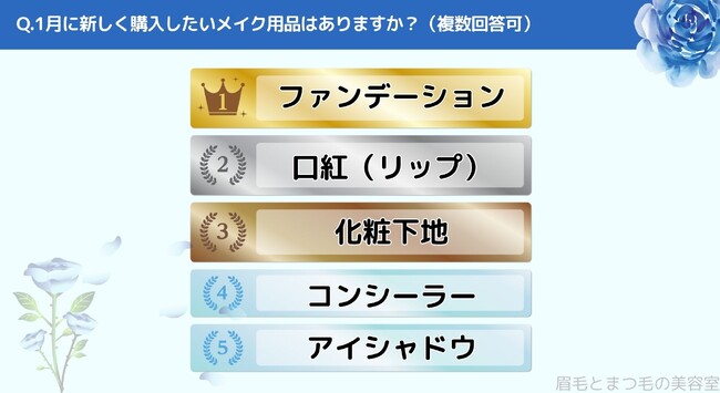 1月に新しく購入したいメイク用品があるかお聞きしたところ「1位>ファンデーション」、「2位>口紅(リップ)」、「3位>化粧下地」、「4位>コンシーラー」、「5位>アイシャドウ」という結果になりました。