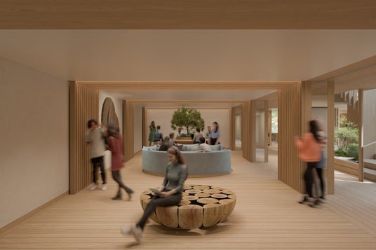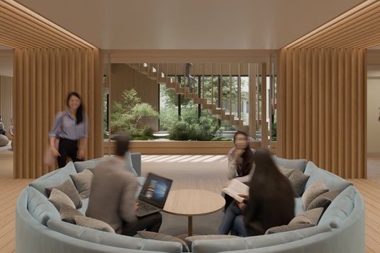 施設内では、2・3階の床構造にNLT(Nail Laminated Timber)(※3)を採用し、フラットで美しい天井空間を実現予定。天井仕上にも木をほどこし、木のぬくもりを視覚的にも体感できる設計としています。また、中庭を中心に食堂やラウンジ、シェアキッチン、多目的スタジオを配置し、自然光と風を取り込む開放的な空間構成としました。さらに、視線が交差する吹き抜け階段を設けることで、学生同士の自然なコミュニケーションを促進。キャンパス内に設置された自主的な学びの場「Learning Commons(※4)」に続く第2のコモンズ「Community-Commons」として、日常生活の中で学びとつながりが生まれる環境を創出します。