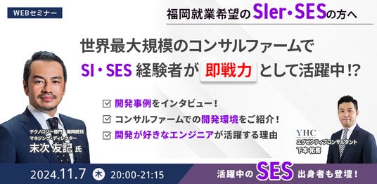 ヤマトヒューマンキャピタル株式会社(本社:東京都千代田区、代表取締役:堀江 大介)は、2024年11月7日(木) 20:00より、ウェビナー『世界最大規模のコンサルファームでSIer・SES経験者が即戦力として活躍中!?』を開催いたします。