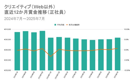 1位の「クリエイティブ(Web以外)」と17位の「医療/医薬/福祉」における直近の月給推移を比較すると、「クリエイティブ(Web以外)」では、2024年10月から11月にかけて求人数が1,000件以上増加し。特に月給25万円以下の求人が多く出稿されたことで高月給帯の割合が減少し、平均月給も下落しました。2025年6月から7月にかけては24万円台の求人数が減少し、あわせて40万~45万円台の求人が増加したことにより平均月給が上昇しました。