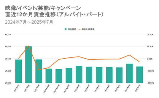 一方、「映像/イベント/芸能/キャンペーン」では、2025年5月から6月にかけて1,300円未満の求人が減少し、2,000円台の高時給求人が増加したことから平均時給が上昇。その後7月にかけては1,200円台の求人が大量に出稿されたことにより高時給帯の割合が減少し、平均時給も下落しました。