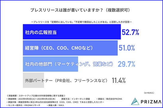 そこで、プレスリリースを出したことがある企業の経営陣に対して、「プレスリリースは誰が書いていますか?」と質問したところ、『社内の広報担当(52.7%)』が最も多く、『経営陣(CEO、COO、CMOなど)(51.0%)』『社内の他部門(マーケティング、営業など)(29.7%)』『外部パートナー(PR会社、フリーランスなど)(11.4%)』と続きました。