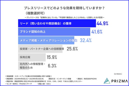 「プレスリリースでどのような効果を期待していますか?」という問いには『リード(問い合わせや商談機会)の獲得(44.9%)』『ブランド認知の向上(41.6%)』『メディア掲載・メディアリレーションの強化(32.4%)』『投資家・パートナー企業への信頼獲得(25.6%)』という回答が得られました。