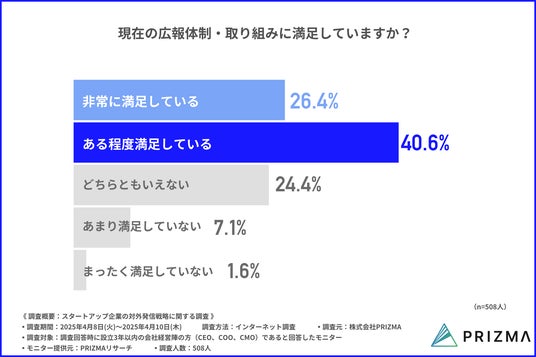 そこで、「現在の広報体制・取り組みに満足していますか?」と、質問したところ『ある程度満足している(40.6%)』が最多で、『非常に満足している(26.4%)』が続きました。