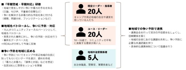 研修を受けた指導者、ユース・リーダーから15人を選び、コミュニティフォーカルパーソンとして、地域のパトロールを行います。コミュニティフォーカルパーソンは他の指導者やユース・リーダーと連携して、パトロールによって発見された争いや暴力の予兆を早期に特定し、その解決に向けた対応を行います。特定された予兆、事例、結果はデータベースに入力され、REALsが分析して活動の改善・改良を行います。