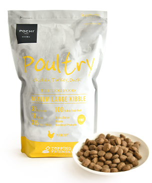 今回、4袋セット(計10.8kg)で販売する「POCHI ザ・ドッグフード ベーシック(ML粒)」(AAFCO、FEDIAF総合栄養食基準適合)は、生肉100%※使用で嗜好性が高いため、多くの犬たちにそのおいしさが支持されています。