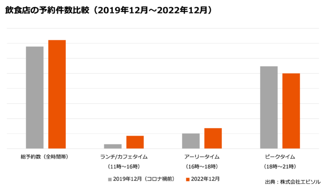 2022年の忘年会シーズンは、総予約数でコロナ禍以前を上回る結果に。一方で、ピークタイムの18時~21時は2019年に満たない状況と客単価に影響も