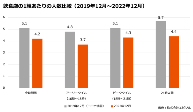 2022年はコロナ禍以前に比べ、全ての時間帯で1組あたりの人数が平均約1人分減少しているなど、少人数の外食が増加