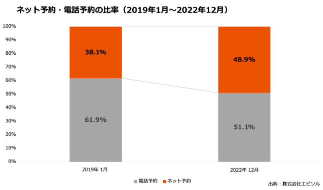 全国の飲食店の予約データを基に、ネット予約と電話予約の比率の推移を見ると、2022年12月ではネット予約が48.9%、電話予約が51.1%となりました。コロナ禍以前の2019年と比較すると、2019年1月はネット予約が38.1%、電話予約が61.9%と、10.8ポイントもの差があることがわかります。