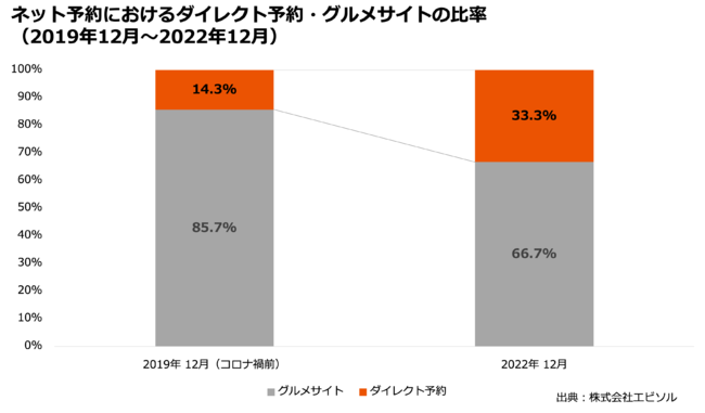 ネット予約の経路では、グルメサイトに比べ、店舗公式サイトなど従量課金がかからないメディアを経由した「ダイレクト予約」の比率が2倍以上に増加