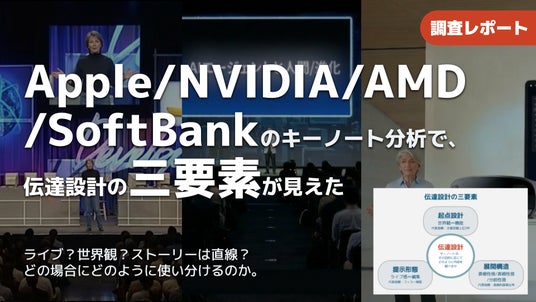 こうした違いをどのように記述すればよいのか。本稿では、伝達設計を「キーノートが、その目的に応じてどのように内容を届けるかを捉える枠組み」であると定義します。各企業が明示的に意識しているか否かにかかわらず、上記のように、既報では伝達設計視点での違いが現れています。つまり、伝達設計を要素分解してそれぞれを定量的に分析することで、明示的に伝達設計を活用する体系を提供できるようになります。