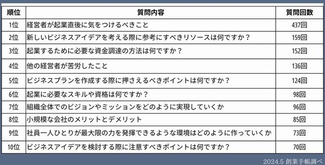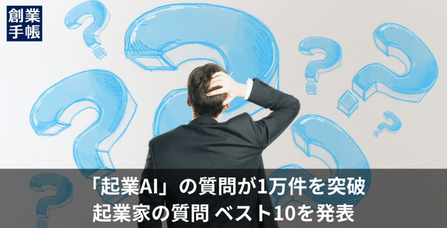 起業家・経営者を支援する創業手帳(本社:東京都中央区京橋、代表:大久保幸世)は、創業手帳が開発した「起業AI(きぎょうアイ)」に寄せられた1万件以上の起業家からの質問や悩みを分析し、ランキング形式で発表しました。