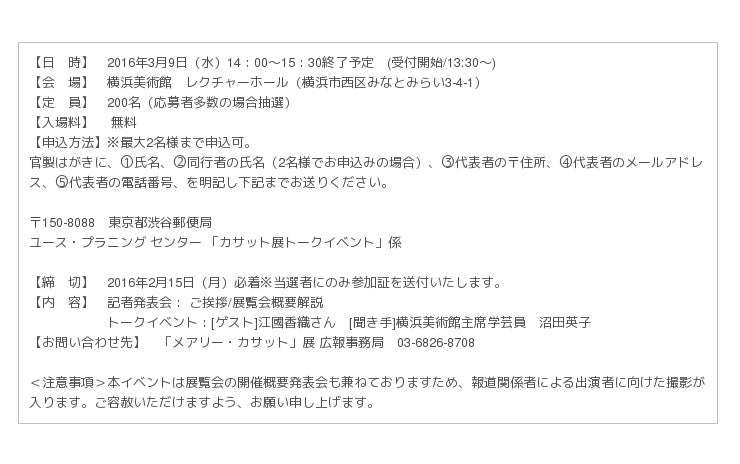 作品の魅力だけでなく、自らの手で画家の道を切り開いたその生き方にも焦点を当て、カサットの生涯についてお話しをうかがいます。また、当日はイベントの冒頭部分で本展の概要や出展作品をご紹介する記者発表会も合わせて実施する予定です。