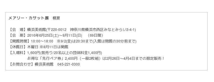 印象派を代表する女性画家、メアリー・カサットの大回顧展が今夏、横浜美術館で開催されます。国内では実に35年ぶり。