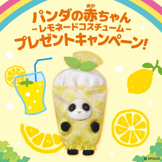 さらに、キラキラくじの半券を、全国の対象おもちゃ販売店にお持ちいただいてお買い物をされた方を対象に、オリジナルコスチュームのパンダの赤ちゃん -レモネードコスチューム- をプレゼントするキャンペーンも実施いたします。