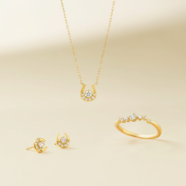 幸せを呼び込むと言われる「馬蹄」のモチーフジュエリー。ペンダントとリングには「ラッキーセブン」にちなんだ7石のダイヤモンドがあしらわれています。ダイヤモンドのきらめきと併せ、程よい地金感と着け心地をお楽しみいただけます。