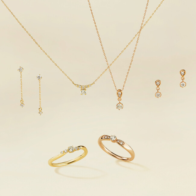 癒しをもたらし、生命力や成長を象徴する「雫(しずく)」モチーフを使用したシリーズは、ダイヤモンドの揺れ感と柔らかなピンクゴールドの発色が優しい印象を作り出します。(写真右)