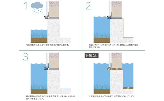 内水氾濫などの水害発生時、水切り本体に内蔵された「水膨張不織布」が膨らむことで床下への浸水を防ぎ、復旧の負担を大幅に軽減します。