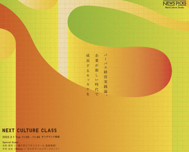 People Tech (テクノロジーによって人の可能性を拡げる) 事業を展開する株式会社アトラエ(本社:東京都港区、 代表:新居佳英、東証一部証券コード:6194、以下 アトラエ) は、エンゲージメント解析ツール「Wevox(ウィボックス)」が「パーパス経営を実装する」をコンセプトにしたNewsPicks NEXT CULTURE CLASS を共催し、Wevoxに属する 中村 友也が登壇することをお知らせいたします。