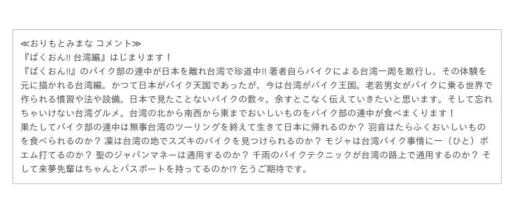 ・『ばくおん!! 台湾編』(おりもとみまな シナリオ原案/太田ぐいや)