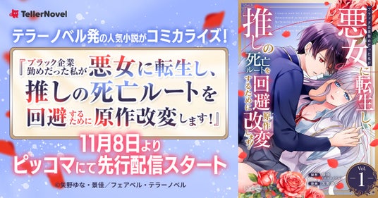 株式会社テラーノベル(本社:東京都港区、代表取締役社長:蜂谷宣人)はこの度、累計DL数760万(※)の小説共有プラットフォーム「テラーノベル( https://teller.jp/ )」発の人気小説『ブラック企業勤めだった私が悪女に転生し、推しの死亡ルートを回避するために原作改変します!』がコミカライズされ、11月8日より電子マンガ・ノベルサービス「ピッコマ」にて先行配信を開始することをお知らせいたします。