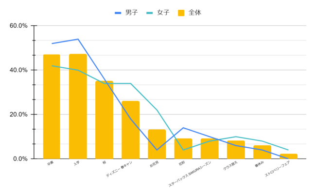 4位には「ディズニー 春キャン」がランクイン。東京ディズニーリゾートが学生向けに販売するパークチケットのことで、今年は3年ぶりの販売復活であったことからSNS上でも話題となっていました。またランキング外では、ユニバーサル・スタジオ・ジャパンが企画する「ユニ春」なども挙がっており、ただ春を彷彿とさせるだけでなく、学生時代にしか体験出来ないことや思い出を作れるイベントやシチュエーションに注目しているようでした。