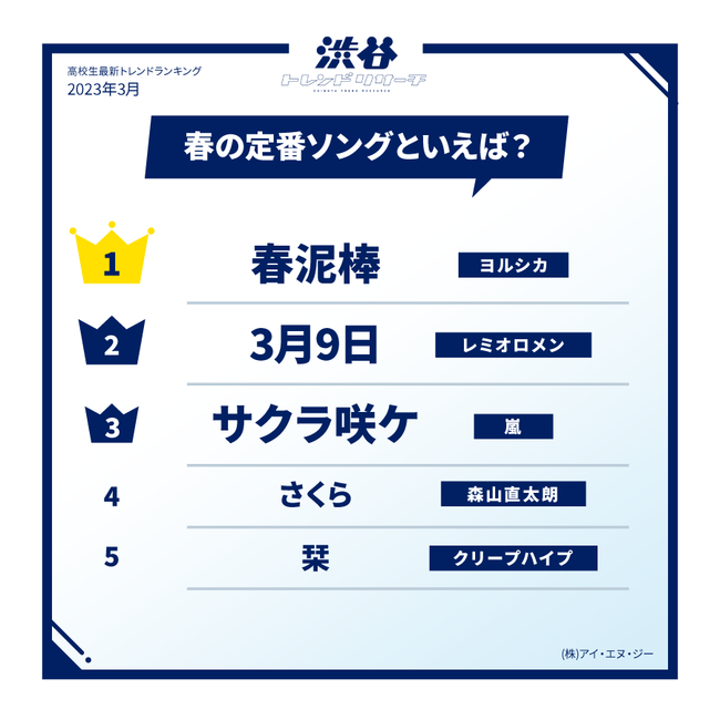 ランキングの上位には、"桜"というキーワードや春らしい爽快感のある楽曲が挙がっており、弊社が2023年2月に公開した調査「卒業式の定番ソングランキング2023」の選出傾向とは異なる結果となりました。