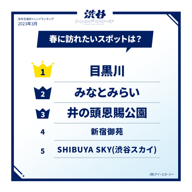桜の名所である「目黒川」が1位を獲得。圧倒的な桜の本数と水面に浮かぶ花びらは、フォトジェニック消費*を求める高校生に人気が高く、毎年訪れているという声が多数寄せられました。また、"名入りボンボリ"のように、自分の推しの名前を入れられるアクリルキーホルダー"ナカメぼんぼり"の販売が開始されたことも、人気を集めた要因の一つのようです。